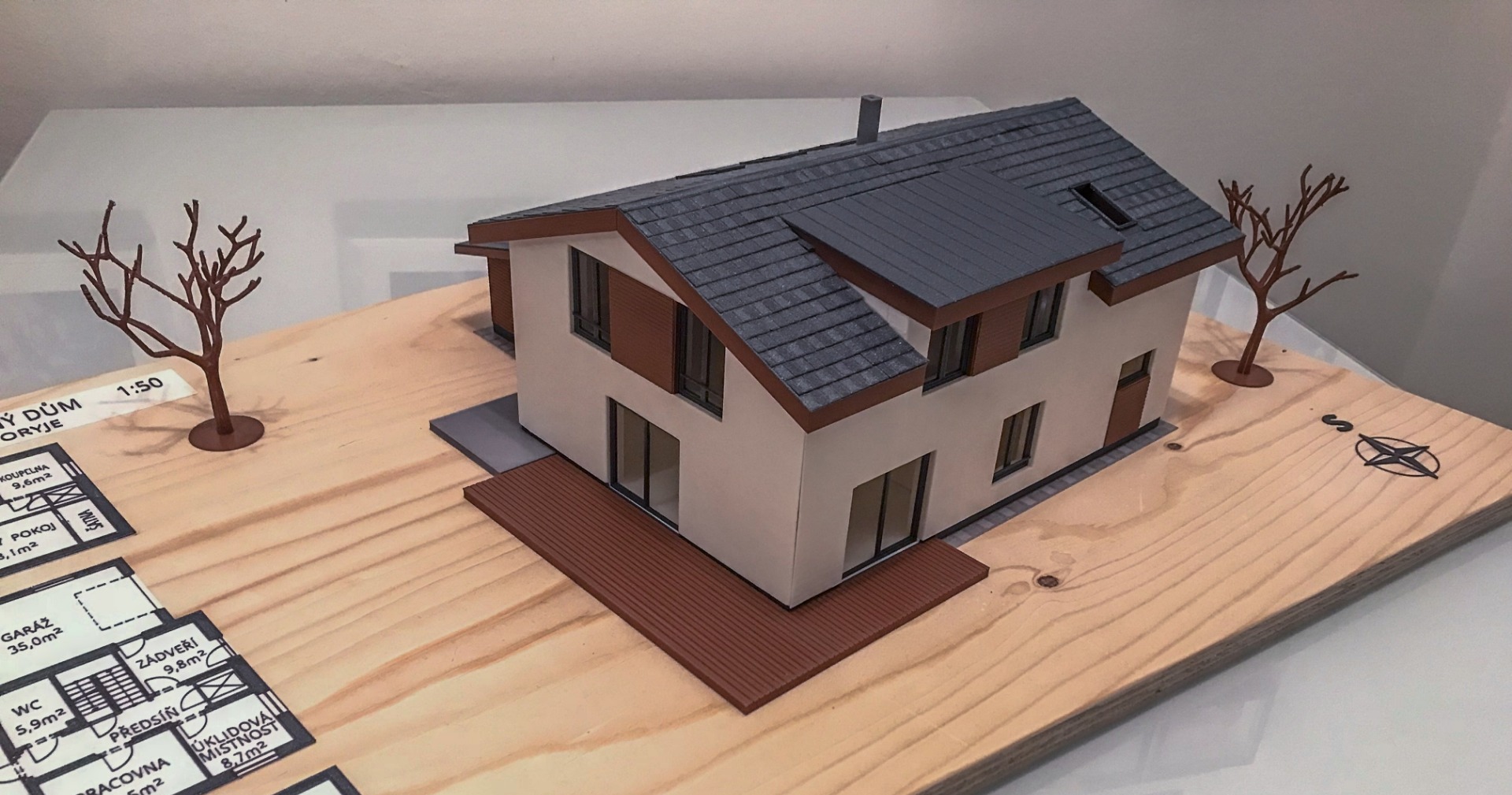 Model rodinného domu v měřítku 1:50 je sestaven asi ze 140 různých dílů postupně vytištěných na 3D tiskárně technologie, FDM .